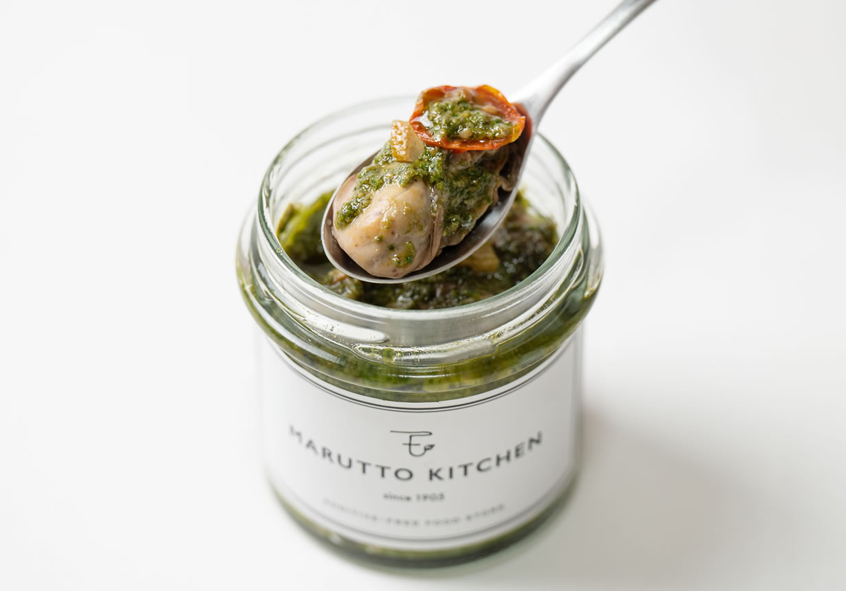 Made with Miyagi Prefecture oysters harvested at their peak flavor. Our original Genovese sauce features dried tomatoes and coarsely chopped locally sourced lemons for accent. Fresh basil is used to enhance both color and aroma, emphasizing freshness. We prioritize domestic ingredients whenever possible and use no chemical seasonings or preservatives. Enjoy on baguettes or crackers, or use in pasta, salads, and more.