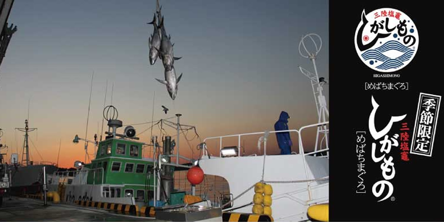 三陸東沖で、秋口から冬場(9月〜12月)にかけてマグロ延縄船によって漁獲され、塩釜市魚市場に水揚げされる生マグロ類のうち、特にメバチマグロは「鮮度」「色つや」「脂のり」「うまみ」に優れ、塩釜にいる日本一の目利き人(仲買人)の目にかなったものを「三陸塩竈ひがしもの」として売り出しています。